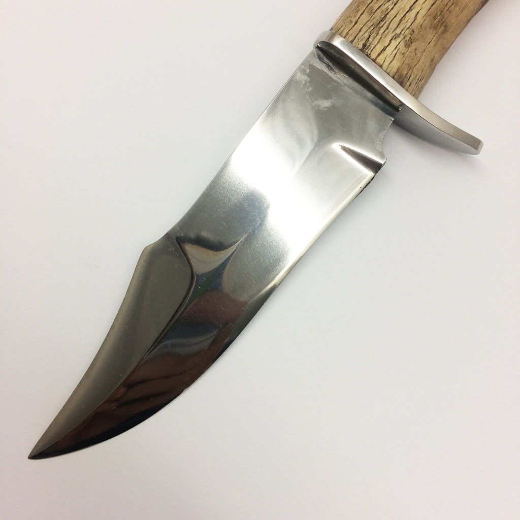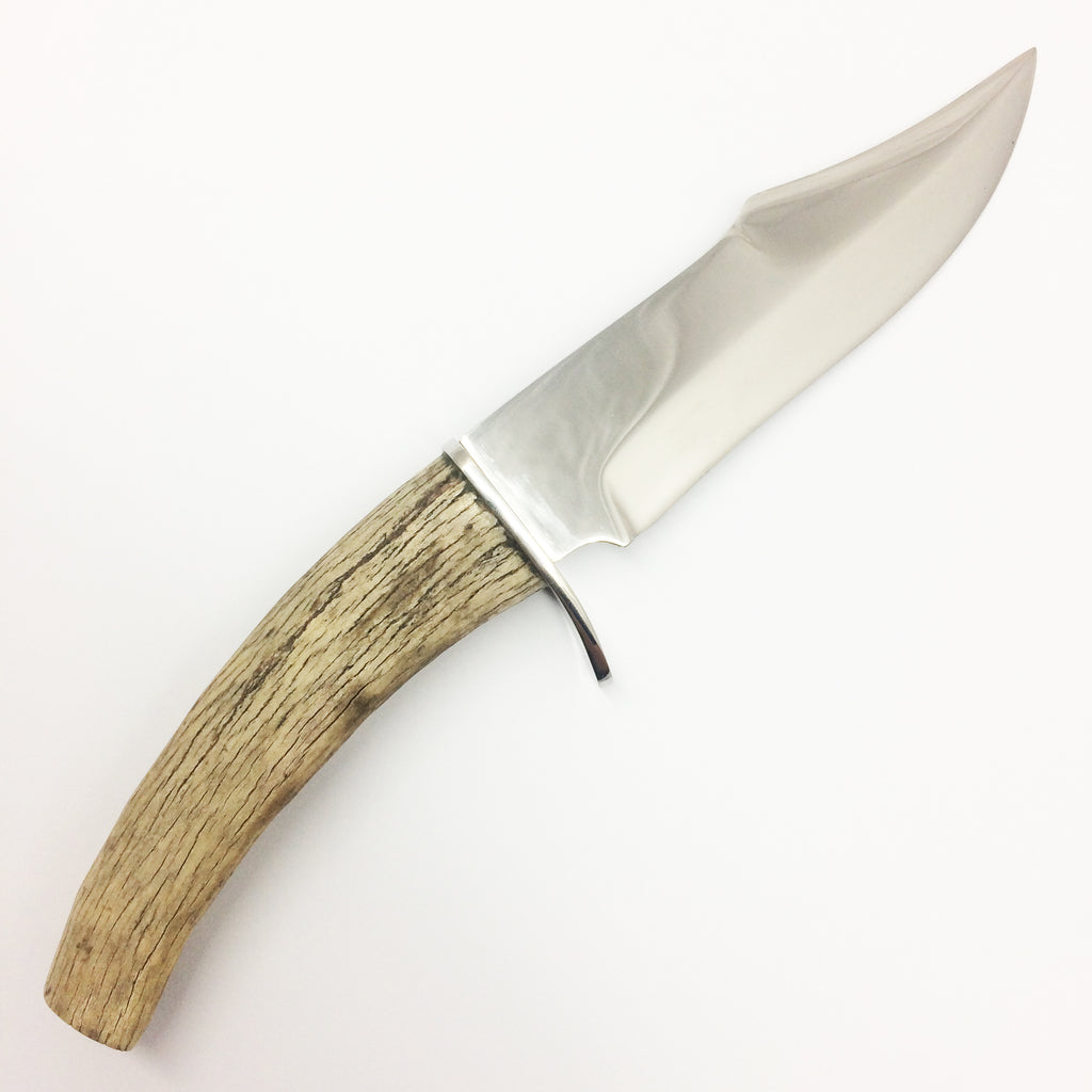 Stainless steel Deer Horn handle knife with stainless steel handguard. Comes with hand tooled and hand stitched full grain leather.
