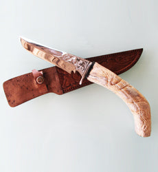 Deer horn hunting knife with hand engraved stainless steel blade.