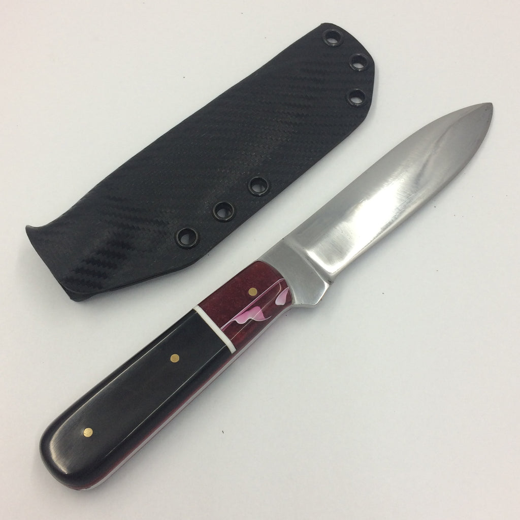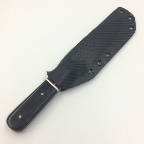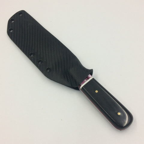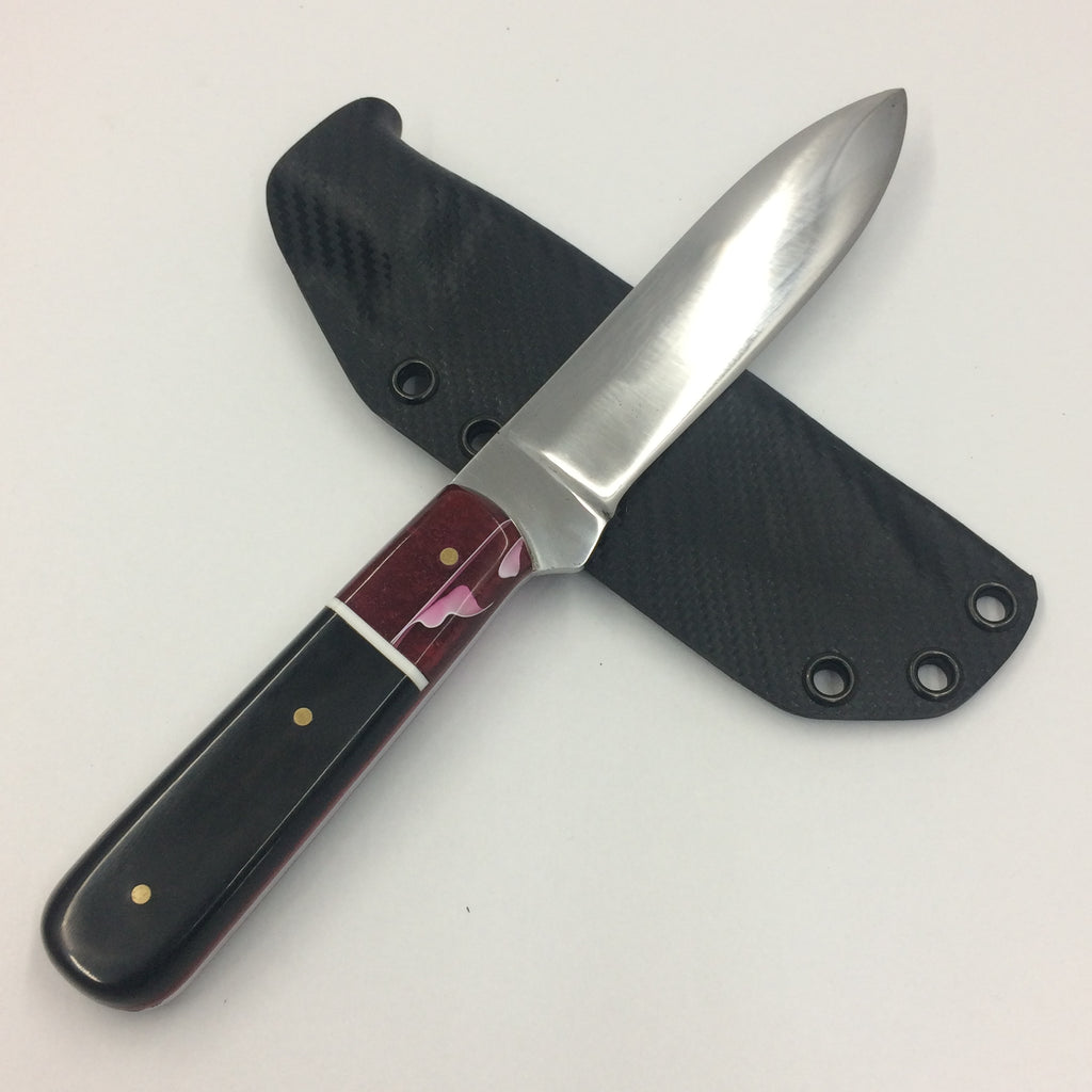 This is our take on the legendary Kephart profile knife. Mirror polished 5160 full tang construction with WoodRiver® Acrylic with black Carabao Horn scales secured with 3 brass pins.