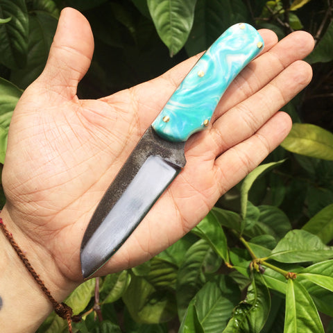 Neck Knife version of our newly released Camp Knife. High carbon steel with Imitech® Blue scales.